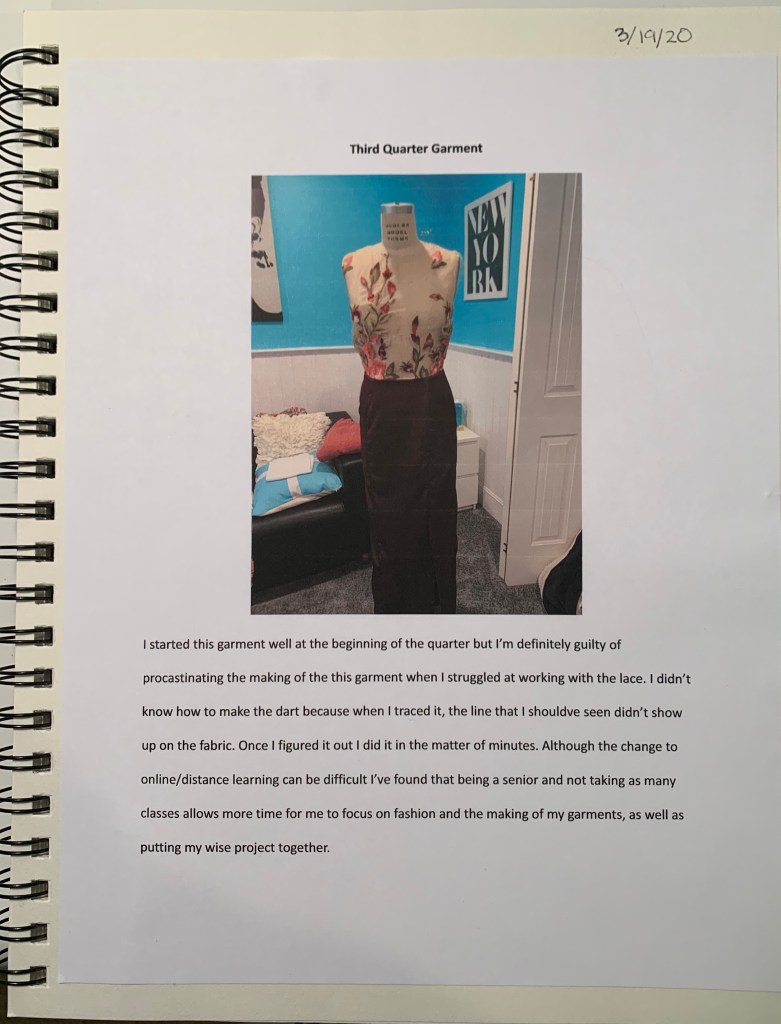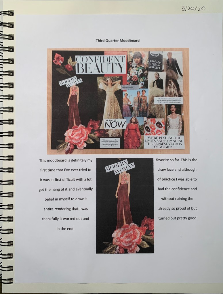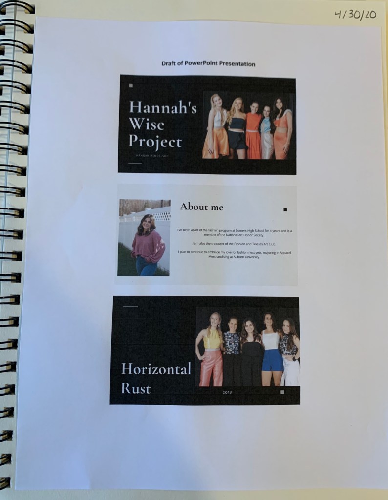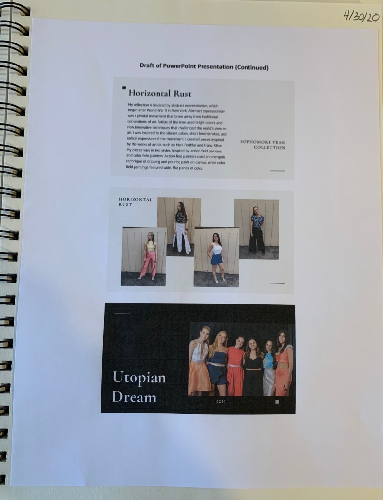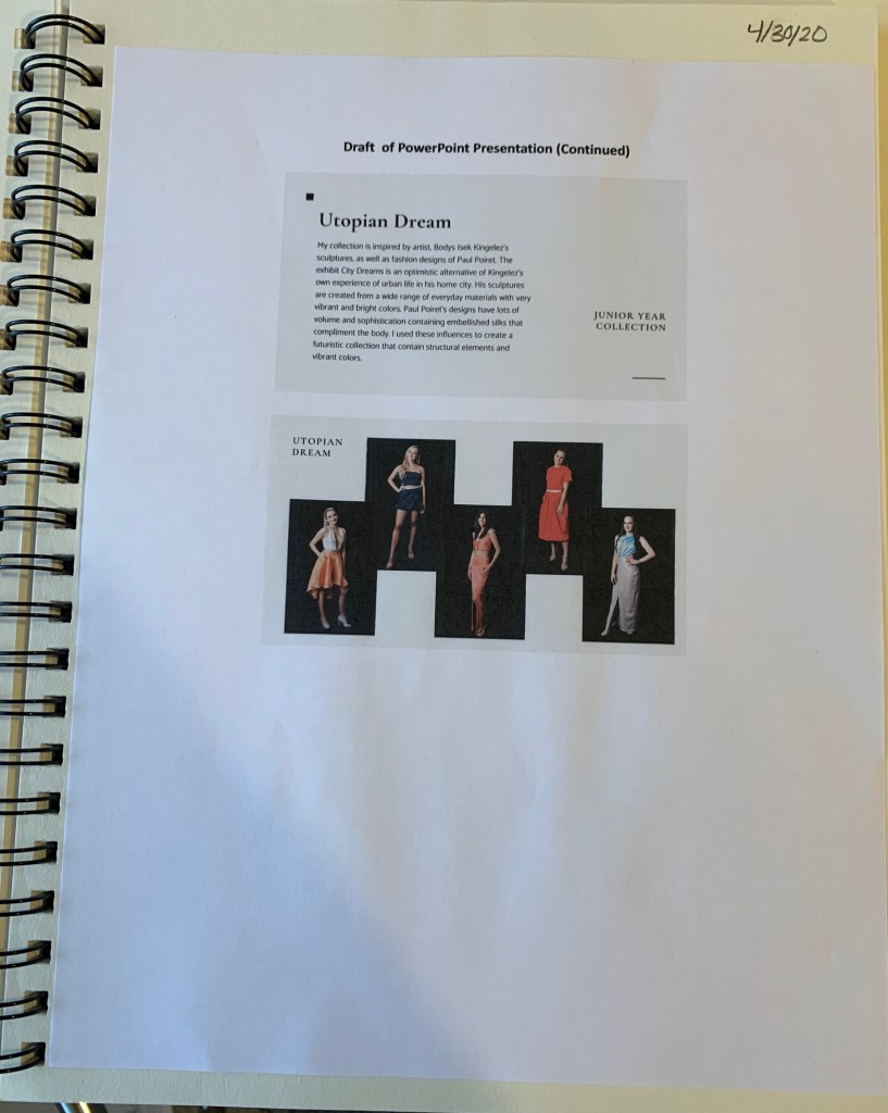 For my presentation, I decided to use Canva, a simple to use graphic design tool, which has many creative templates that make the presentation different and original instead of just using a normal template in PowerPoint, which limits how much I can do creatively. It will take me some time though, to figure out how I want to include my senior year collection since I most likely won’t have the opportunity for the models to wear the garments, but I definitely still plan to include this years collection because it is by far my favorite out of all of the collections I’ve created.